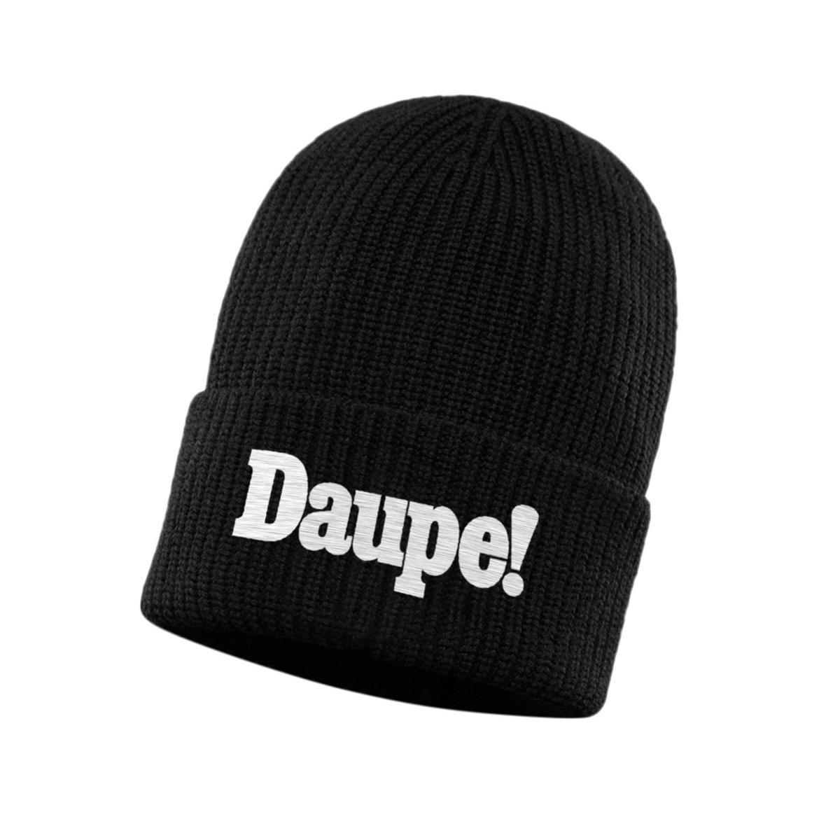 Yupoong ribbed beanie in black with embroidered Daupe! logo. Limited to 100 worldwide